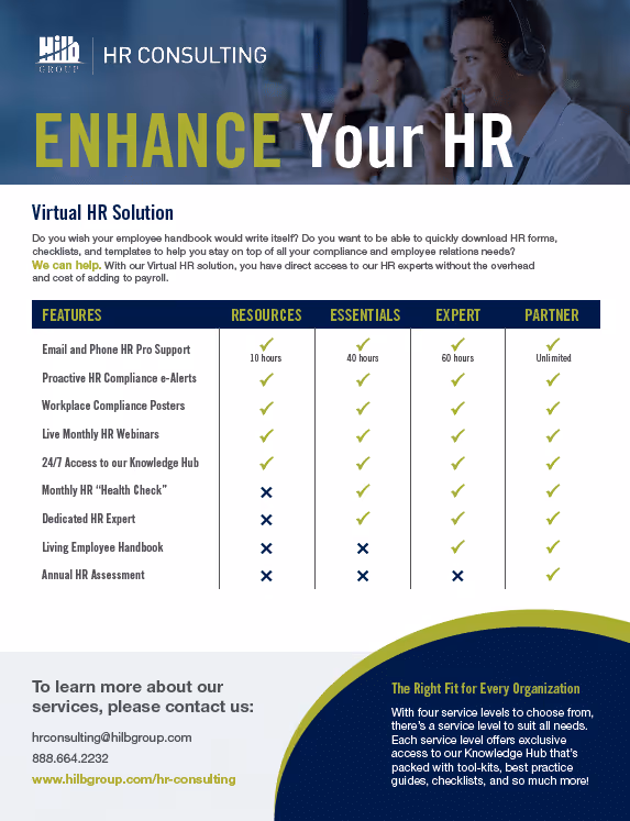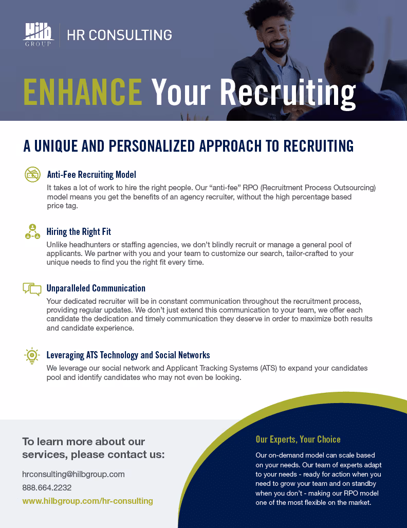 From employee handbooks to recruiting for key roles to staying up-to-date on compliance requirements, human resources can be unnecessarily time-consuming and complex. Hilb Group HR Consulting can help. Big needs, small projects, and everything in between – with our HR Consulting Practice, you have direct access to HR experts without adding to payroll. With more than 2,000 employees and service to all 50 states, Hilb Group has the resources and offerings of a large organization, but with the attention, local connections, and customized solutions that a smaller firm brings. Our clients get more that way – that’s the Hilb difference.